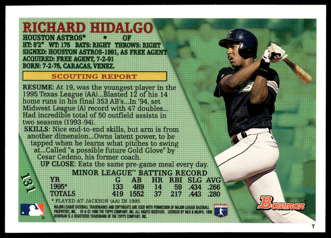 This Baseball card, from 1996 is part of the Bowman  card set. Richard Hidalgo is featured and has a card number of 131.