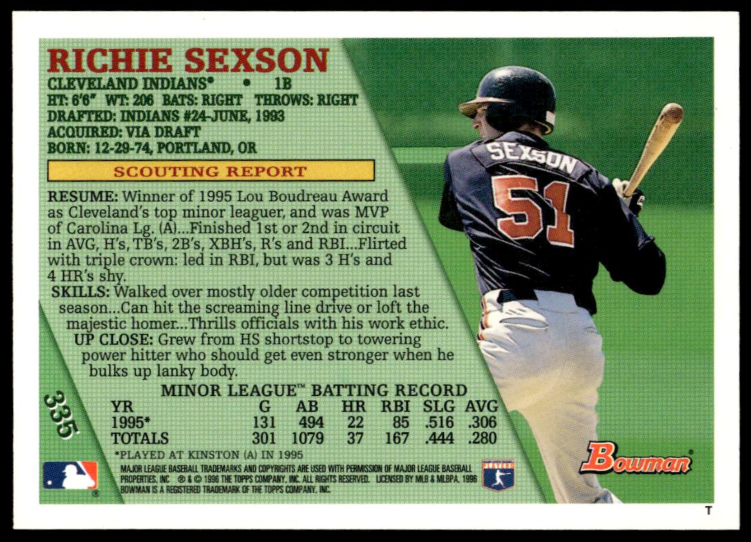 This Baseball card, from 1996 is part of the Bowman  card set. Richie Sexson is featured and has a card number of 335.