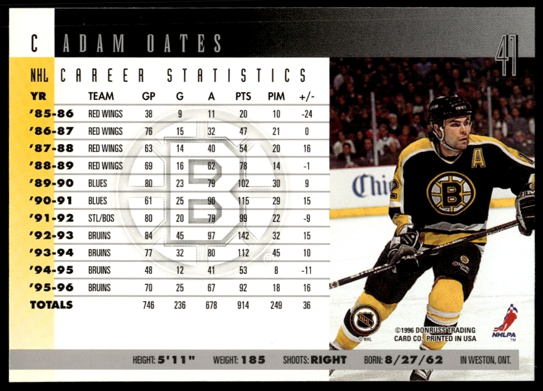 This Hockey card, from 1996 is part of the Donruss card set. Adam Oates is featured and has a card number of 41.