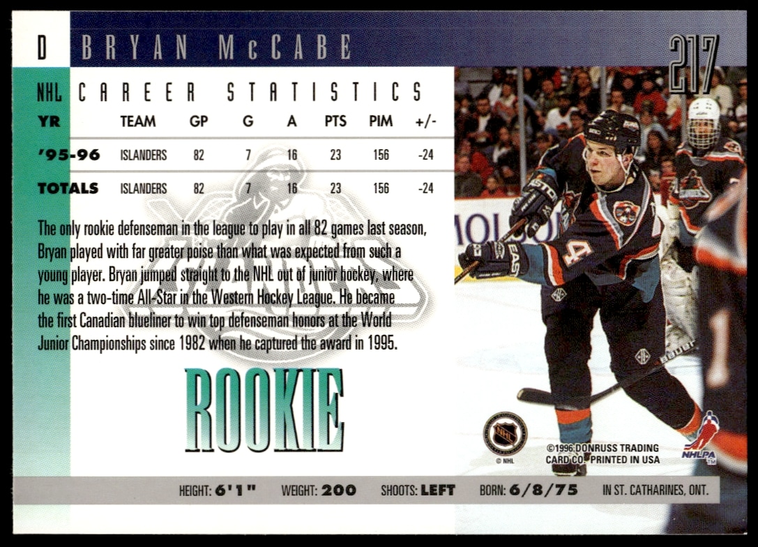 This Hockey card, from 1996 is part of the Donruss card set. Bryan McCabe is featured and has a card number of 217.