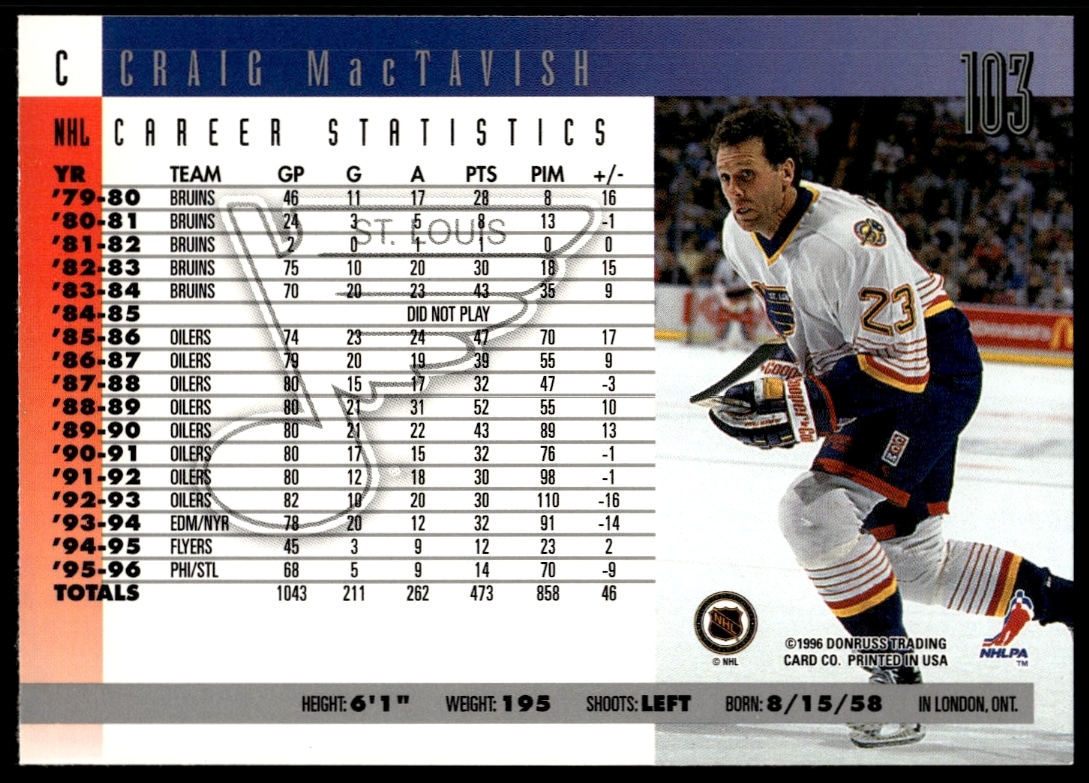 This Hockey card, from 1996 is part of the Donruss card set. Craig MacTavish is featured and has a card number of 103.