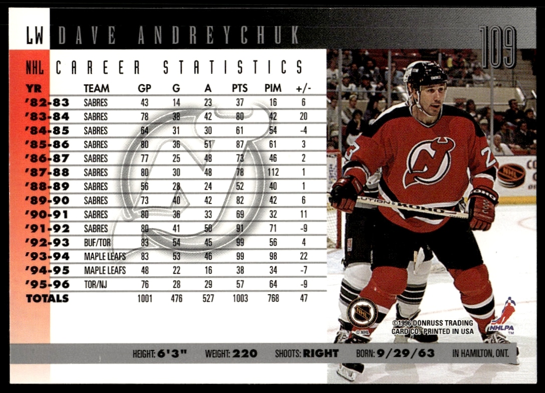 This Hockey card, from 1996 is part of the Donruss card set. Dave Andreychuk is featured and has a card number of 109.