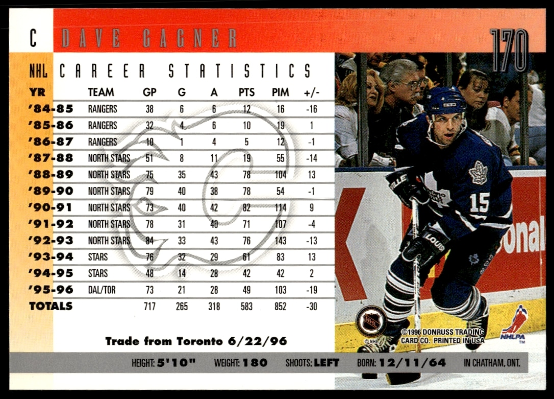 This Hockey card, from 1996 is part of the Donruss card set. Dave Gagner is featured and has a card number of 170.