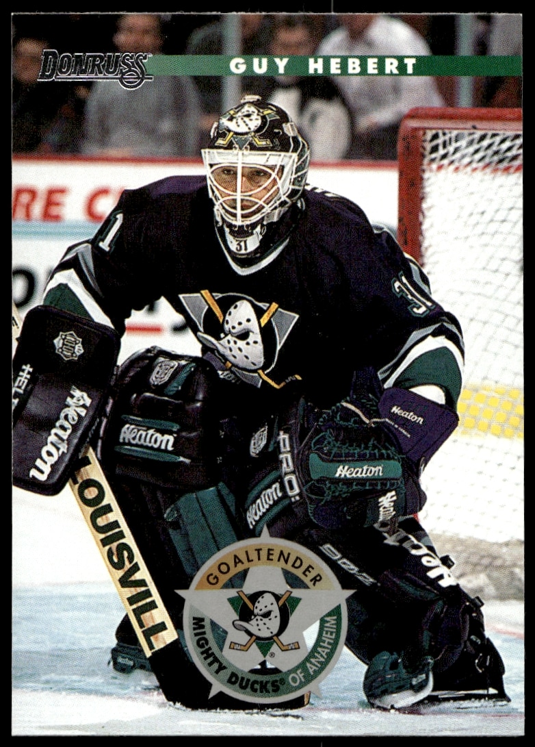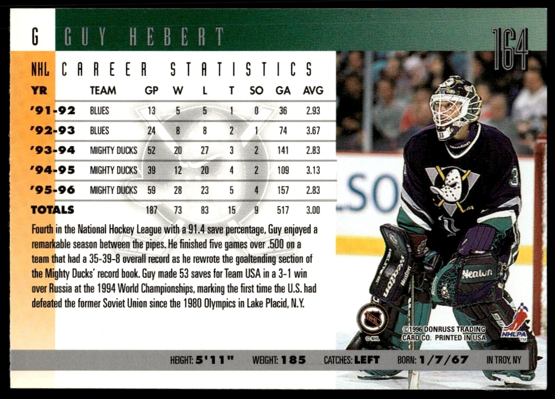 This Hockey card, from 1996 is part of the Donruss card set. Guy Hebert is featured and has a card number of 164.