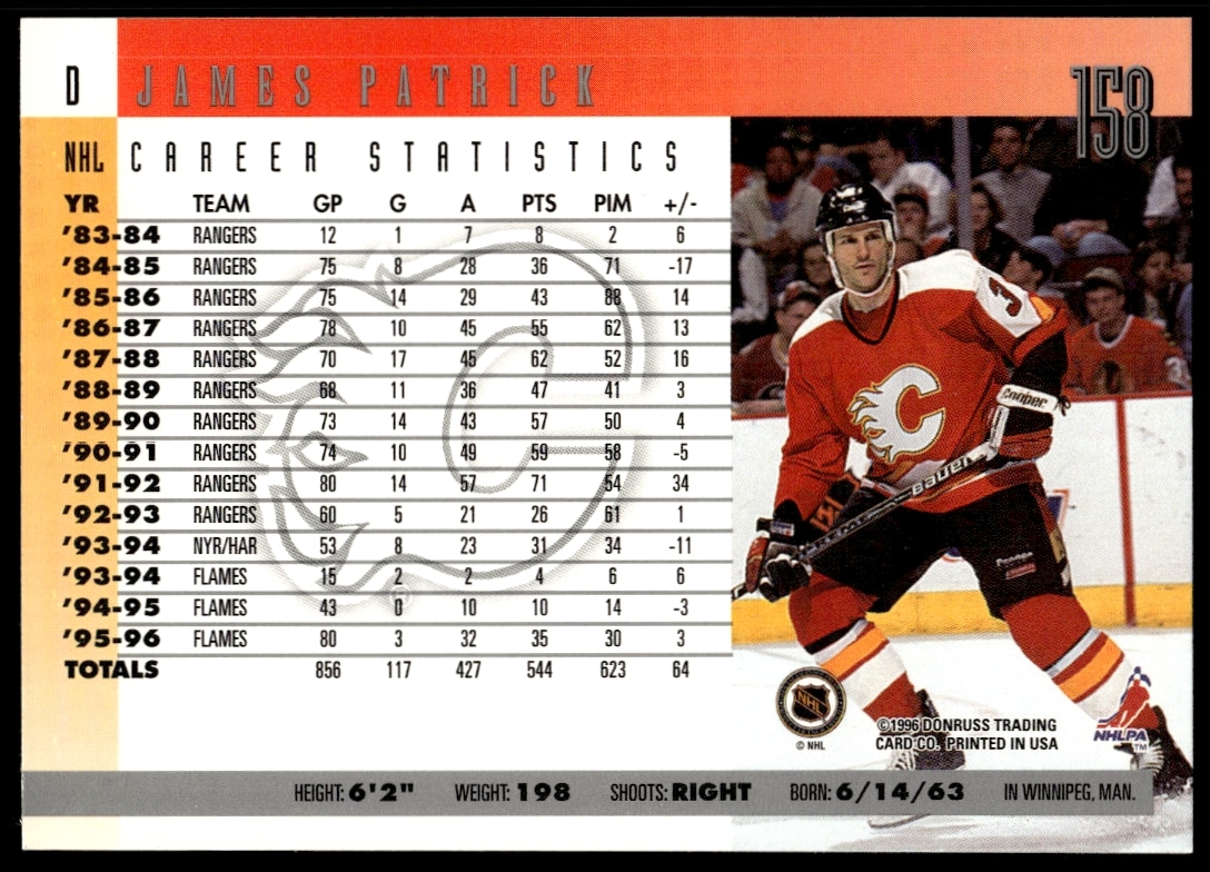 This Hockey card, from 1996 is part of the Donruss card set. James Patrick is featured and has a card number of 158.