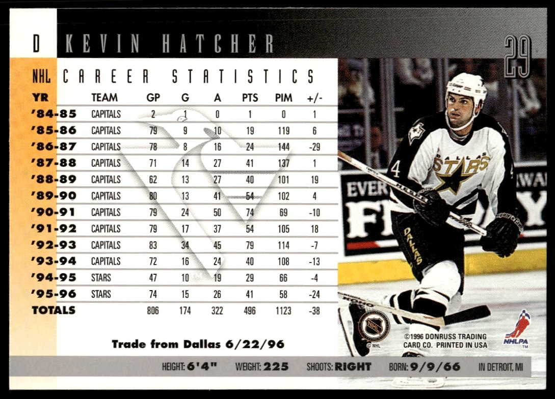 This Hockey card, from 1996 is part of the Donruss card set. Kevin Hatcher is featured and has a card number of 29.