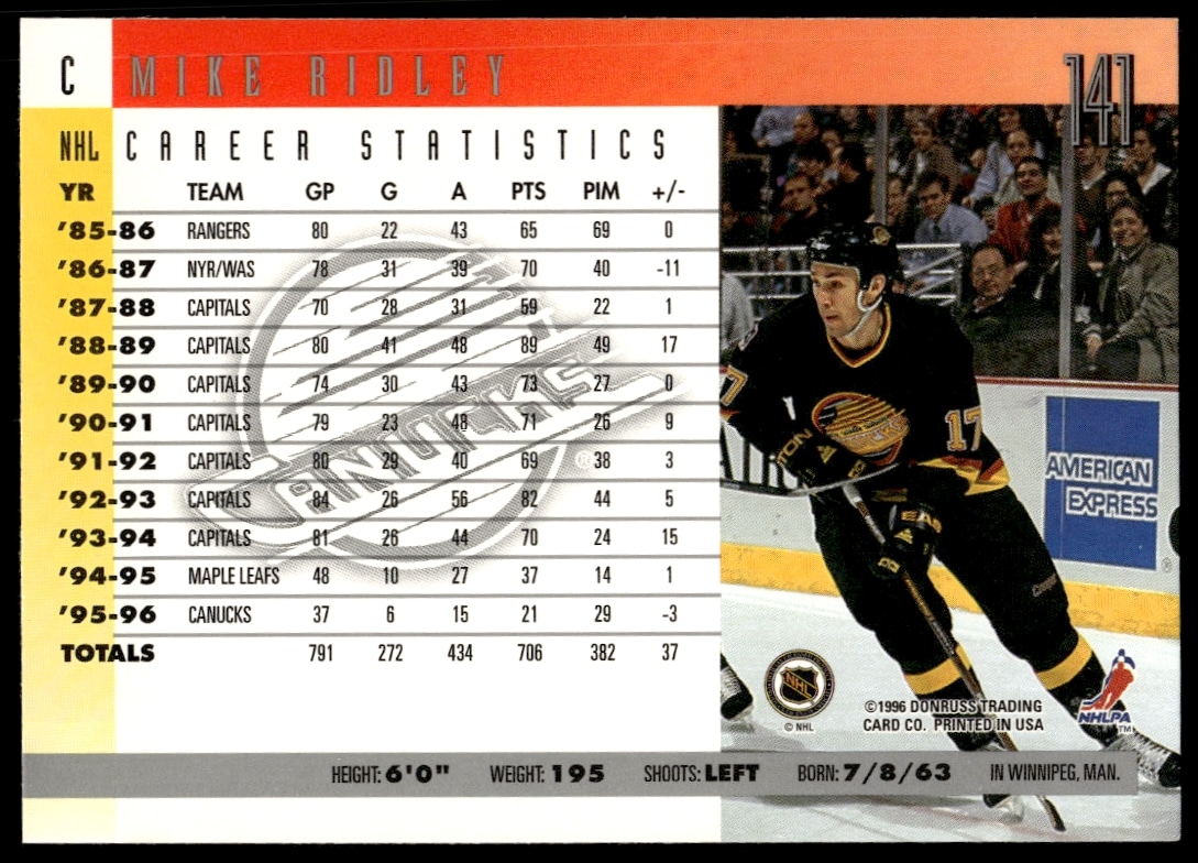 This Hockey card, from 1996 is part of the Donruss card set. Mike Ridley is featured and has a card number of 141.