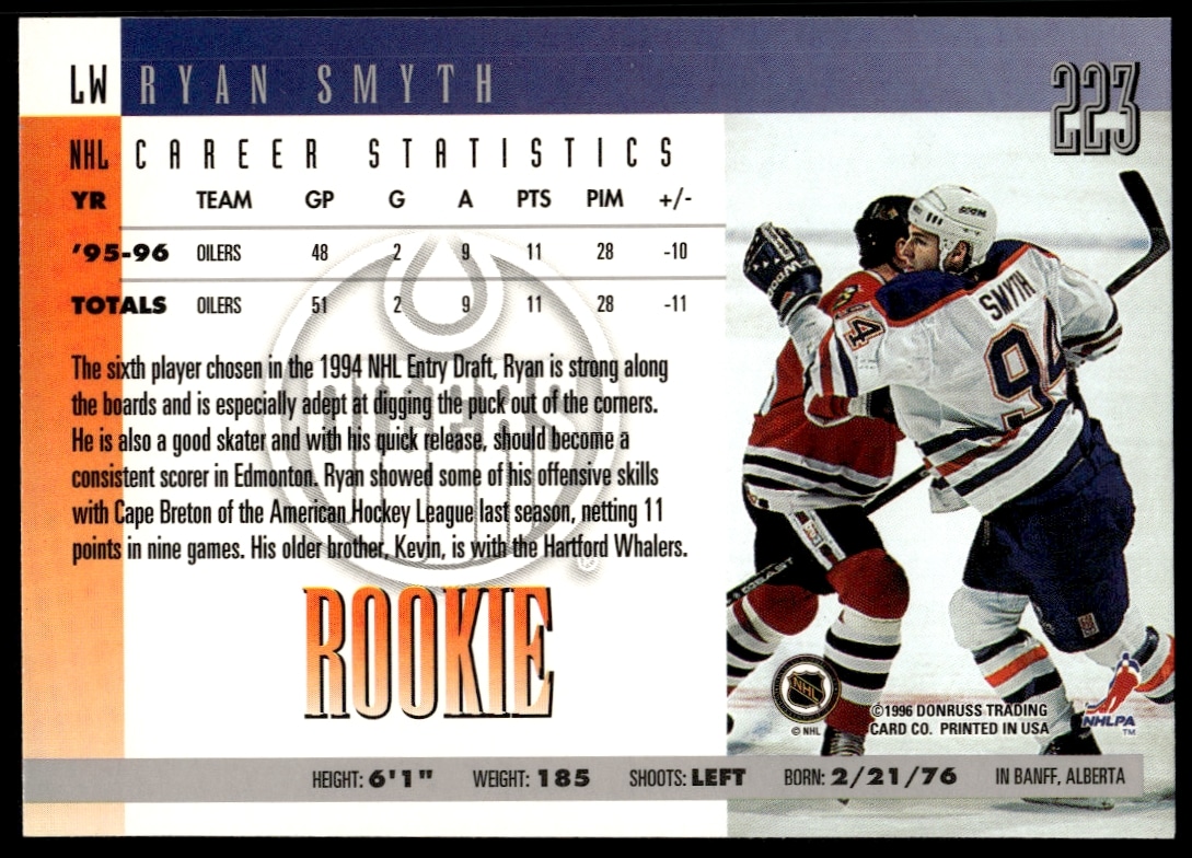 This Hockey card, from 1996 is part of the Donruss card set. Ryan Smyth is featured and has a card number of 223.