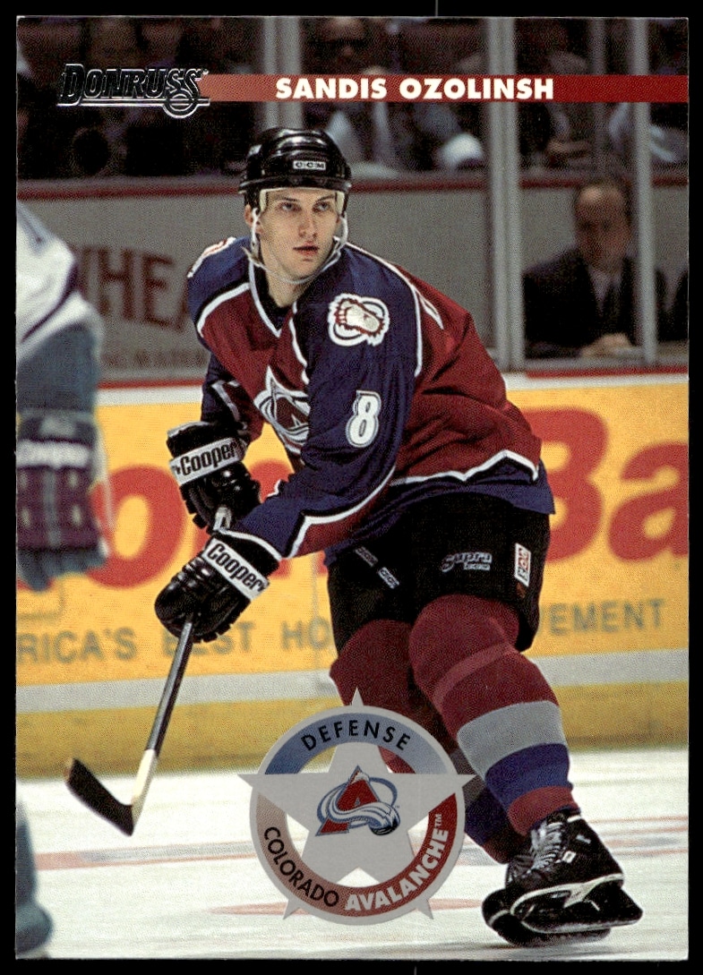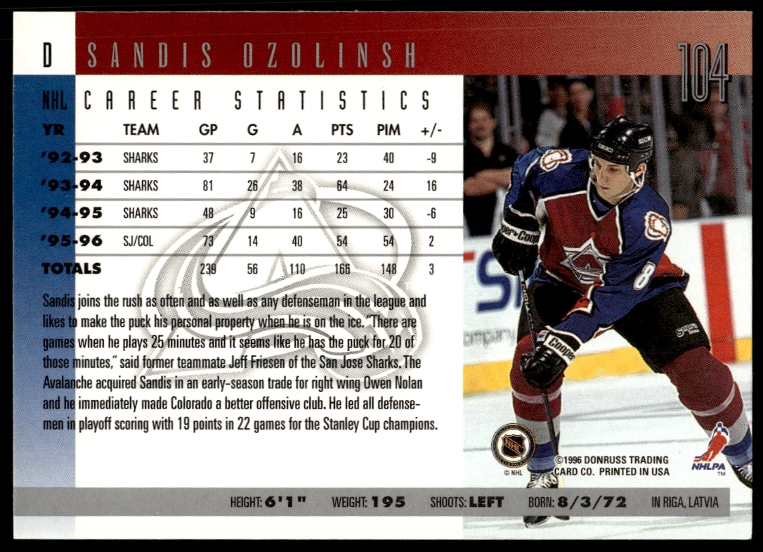 This Hockey card, from 1996 is part of the Donruss card set. Sandis Ozolinsh is featured and has a card number of 104.