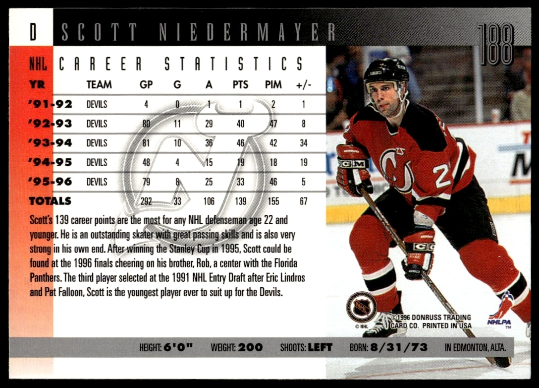 This Hockey card, from 1996 is part of the Donruss card set. Scott Niedermayer is featured and has a card number of 188.