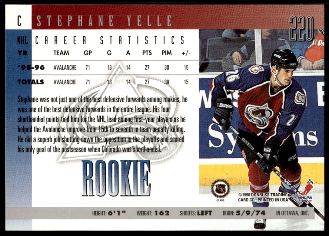 This Hockey card, from 1996 is part of the Donruss card set. Stephane Yelle is featured and has a card number of 220.