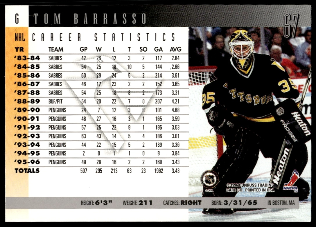 This Hockey card, from 1996 is part of the Donruss card set. Tom Barrasso is featured and has a card number of 67.