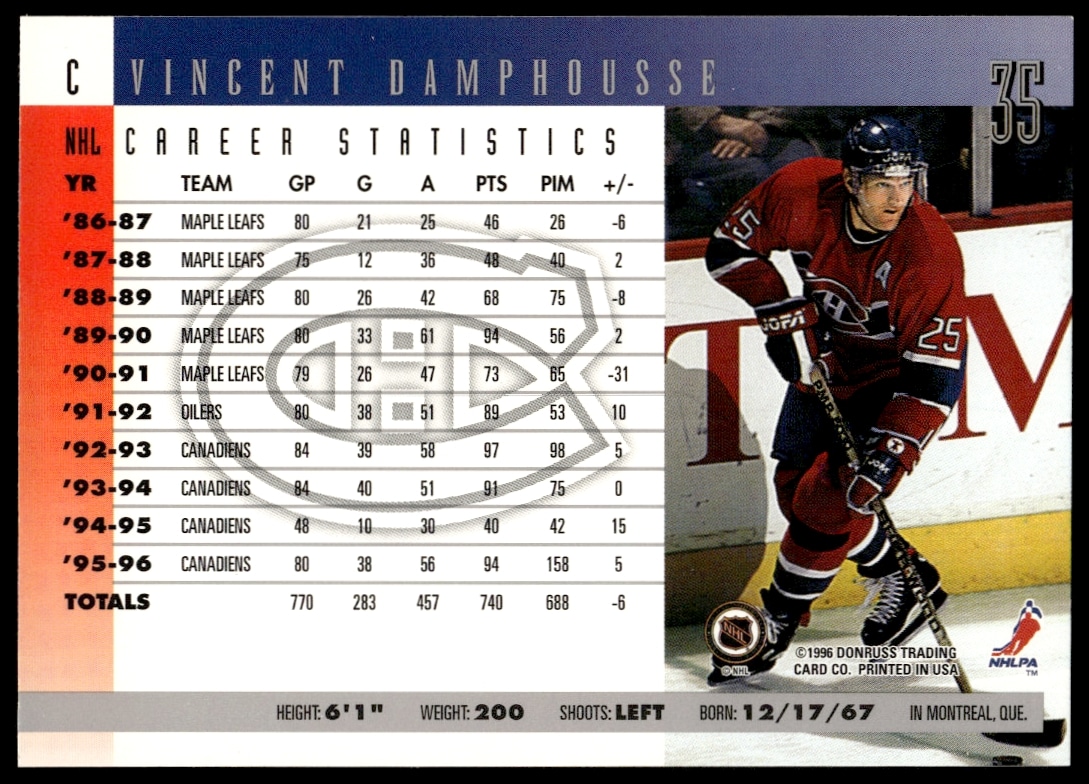 This Hockey card, from 1996 is part of the Donruss card set. Vincent Damphousse is featured and has a card number of 35.