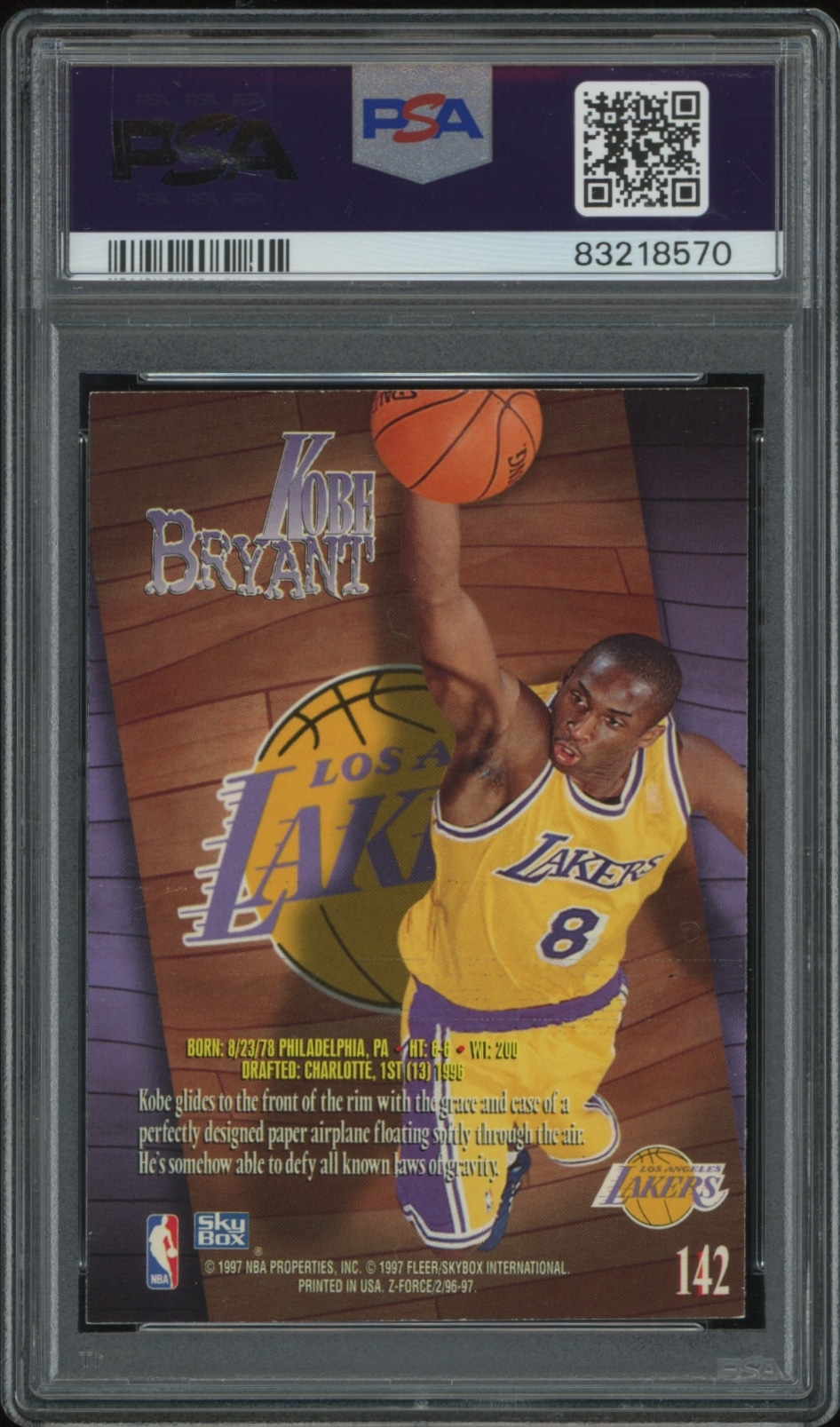 This Basketball card, from 1996 is part of the SkyBox Z-Force card set. Kobe Bryant is featured and has a card number of 142. It is graded by PSA and has a numeric grade of 3.