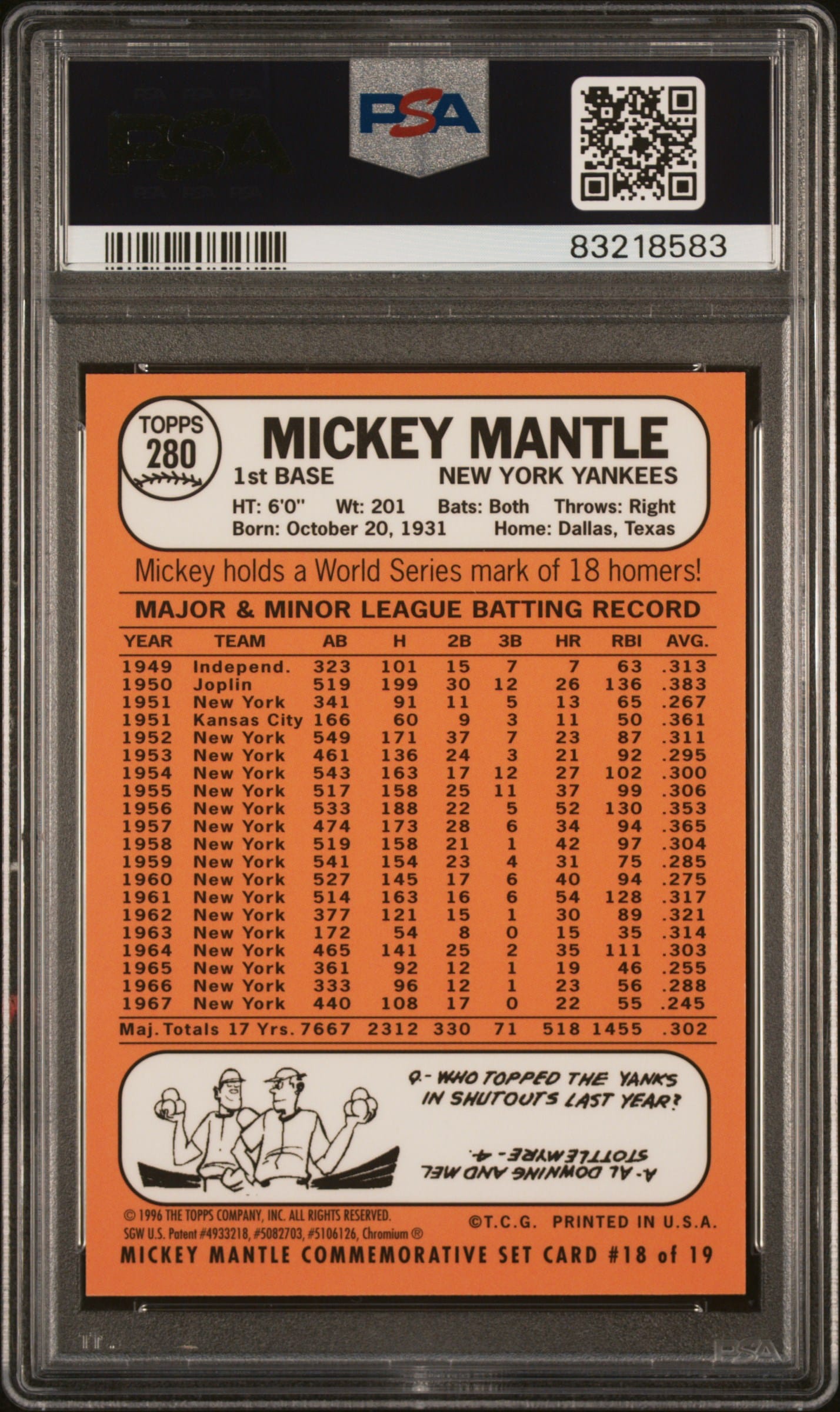 1966 Topps Finest Mickey Mantle reprint, graded PSA 8, features a protective coating. A must-have for collectors!