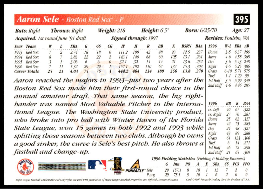 This BaseballΒ card, from 1997 is part of the Pinnacle ScoreΒ card set. Aaron Sele is featured and has a card number of 395.