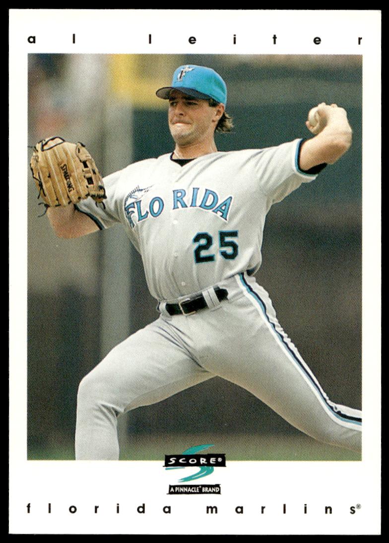 This Baseball card, from 1997 is part of the Pinnacle Score card set. Al Leiter is featured and has a card number of 124.