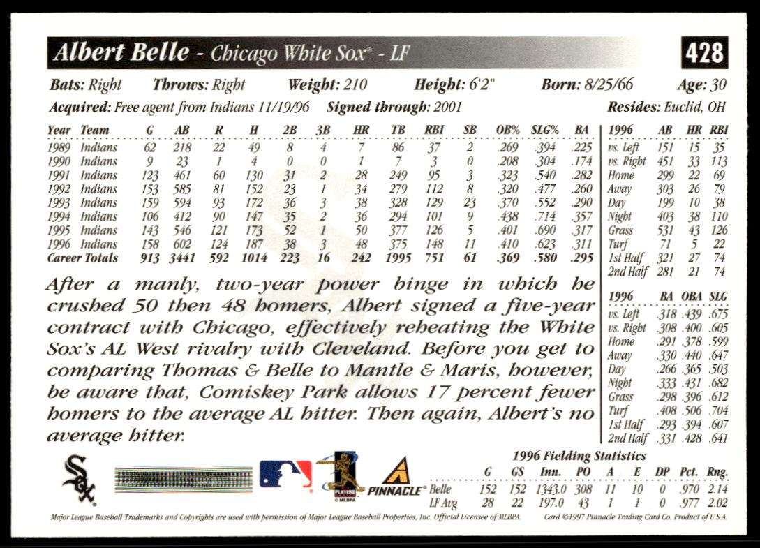 This BaseballΒ card, from 1997 is part of the Pinnacle ScoreΒ card set. Albert Belle is featured and has a card number of 428.