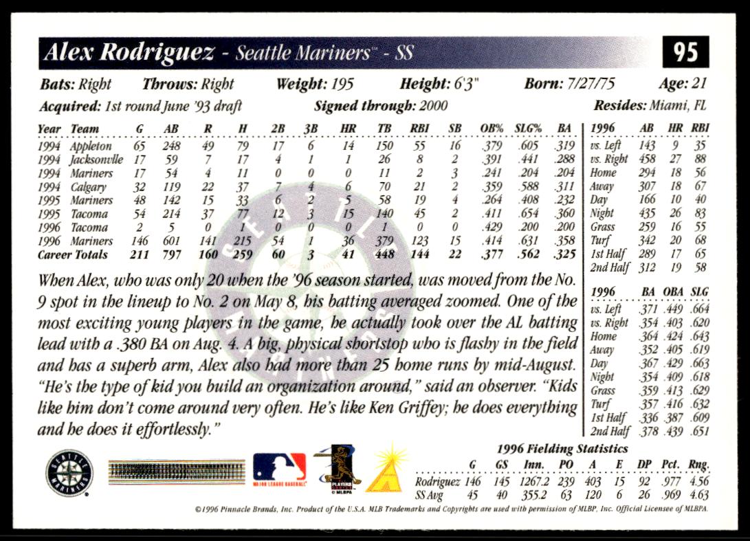 This Baseball card, from 1997 is part of the Pinnacle Score card set. Alex Rodriguez is featured and has a card number of 95.