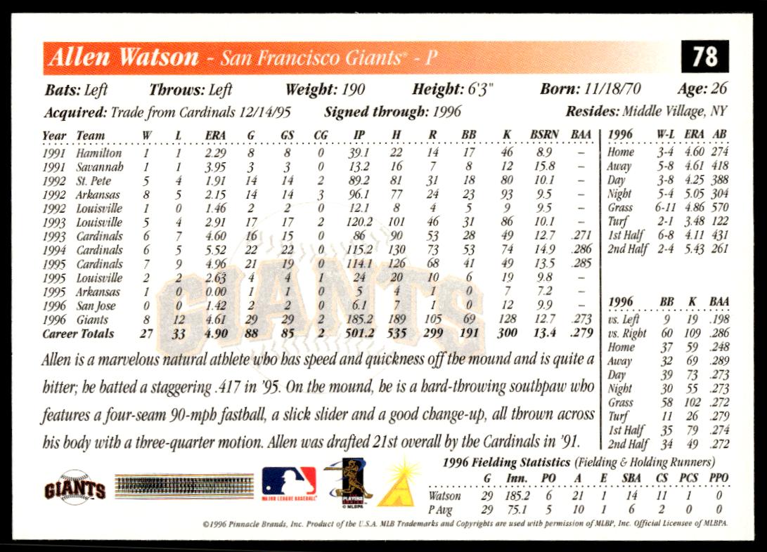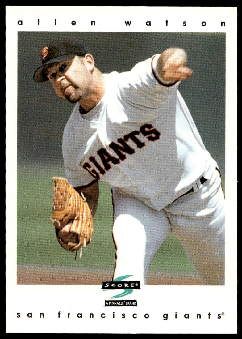 This BaseballΒ card, from 1997 is part of the Pinnacle ScoreΒ card set. Allen Watson is featured and has a card number of 78.