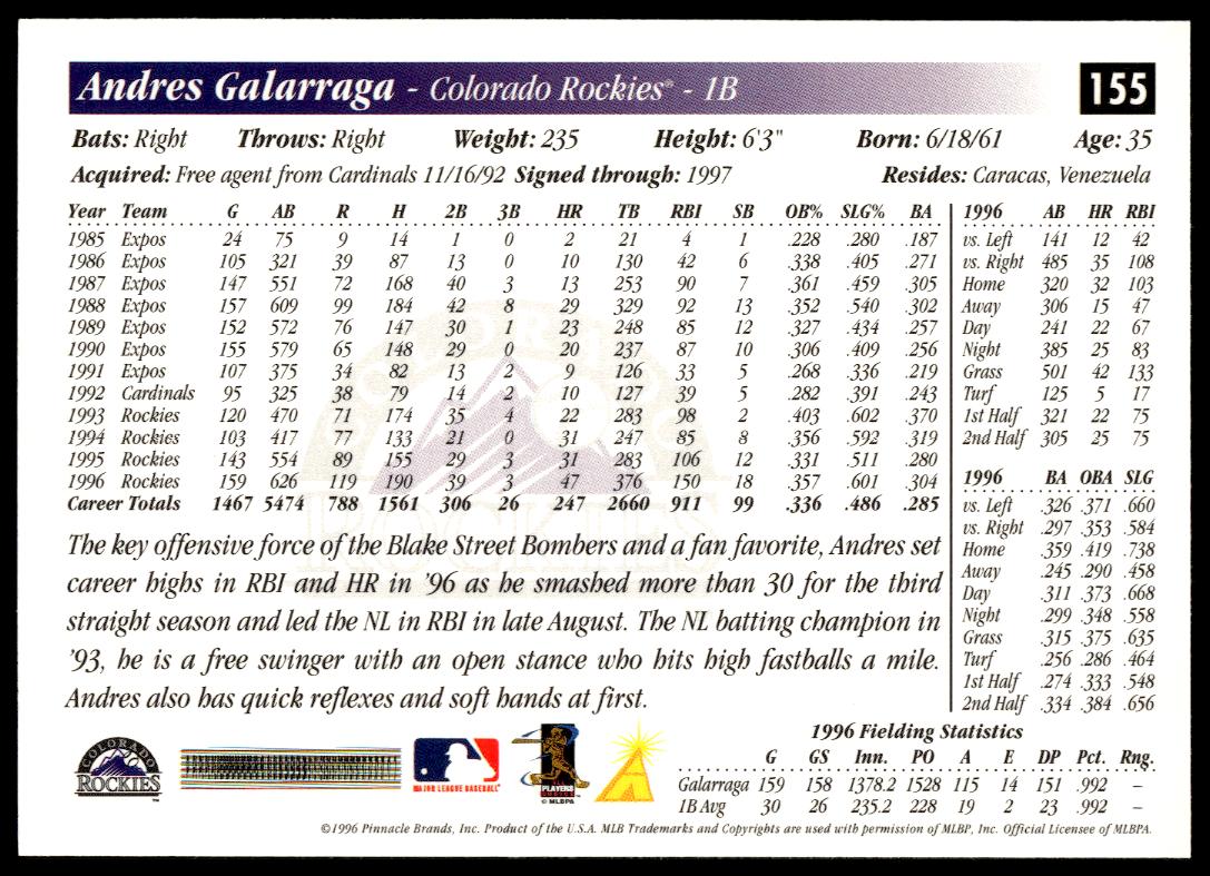 This BaseballΒ card, from 1997 is part of the Pinnacle ScoreΒ card set. Andres Galarraga is featured and has a card number of 155.