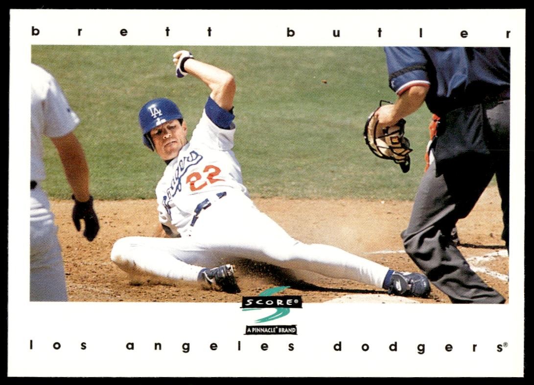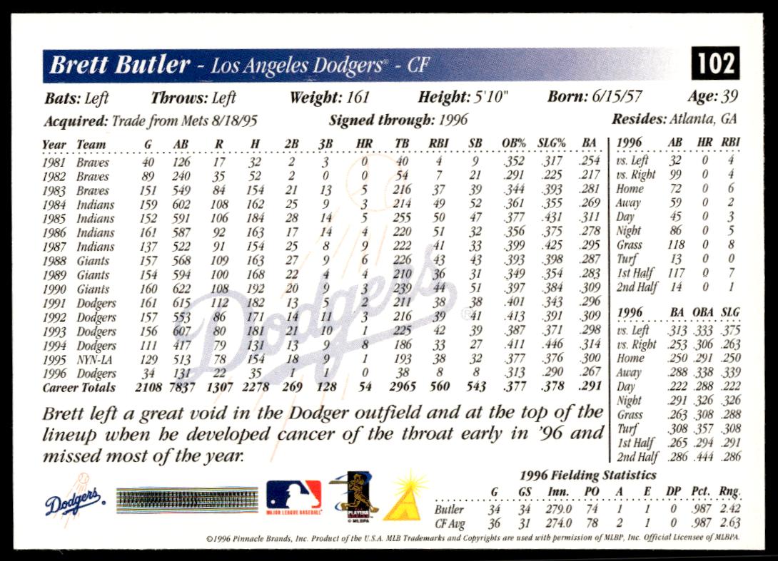This Baseball card, from 1997 is part of the Pinnacle Score card set. Brett Butler is featured and has a card number of 102.