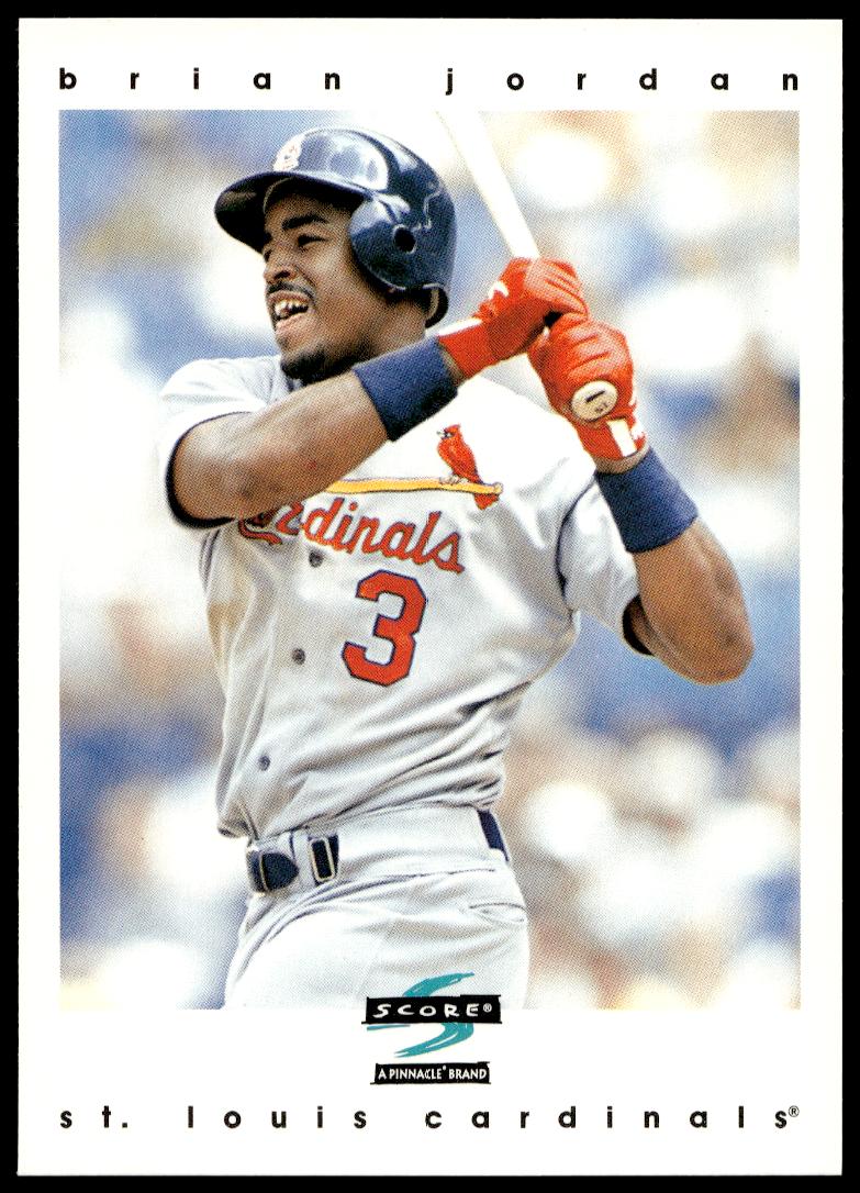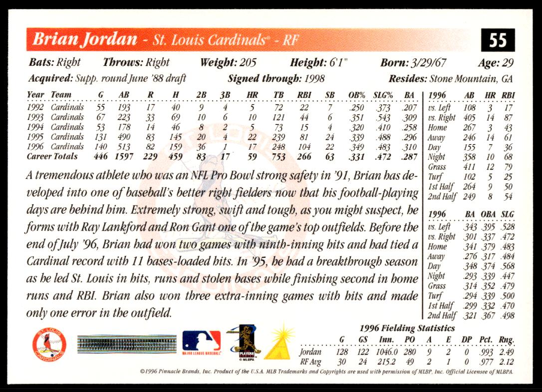 This BaseballΒ card, from 1997 is part of the Pinnacle ScoreΒ card set. Brian Jordan is featured and has a card number of 55.