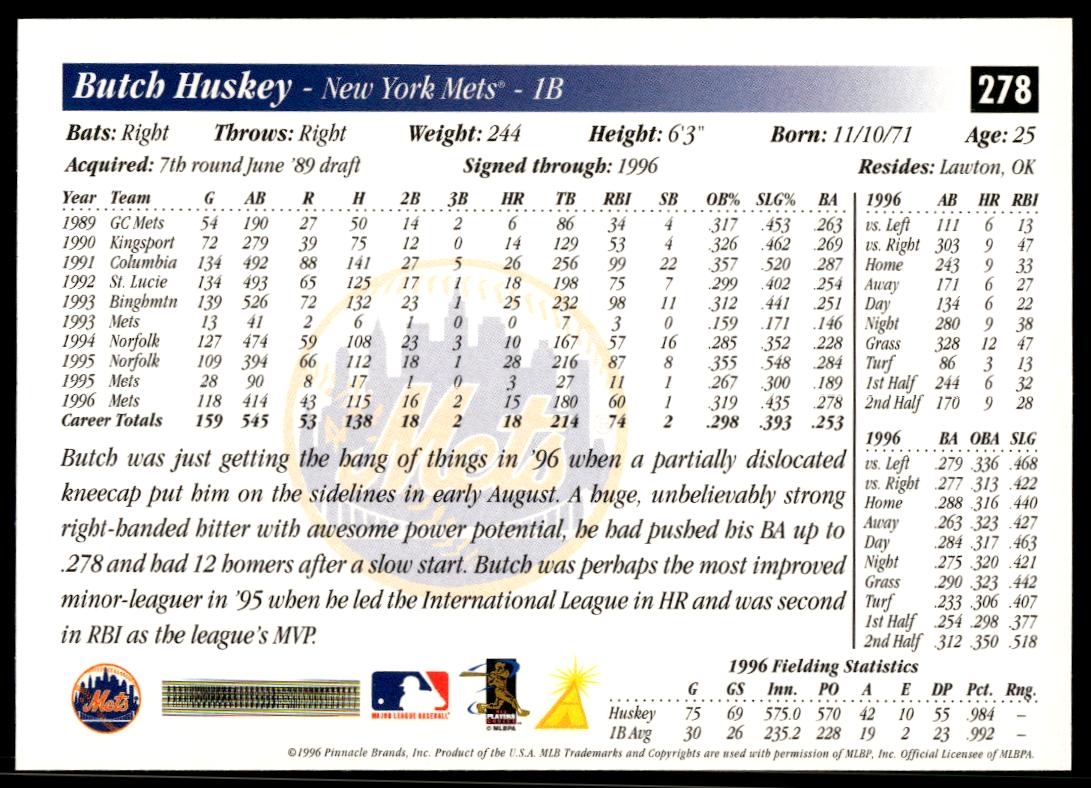 This BaseballΒ card, from 1997 is part of the Pinnacle ScoreΒ card set. Butch Huskey is featured and has a card number of 278.