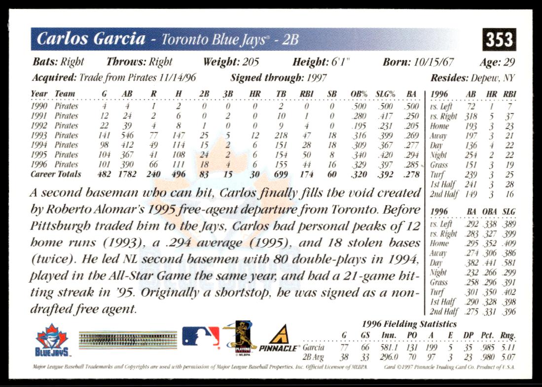 This Baseball card, from 1997 is part of the Pinnacle Score card set. Carlos Garcia is featured and has a card number of 353.
