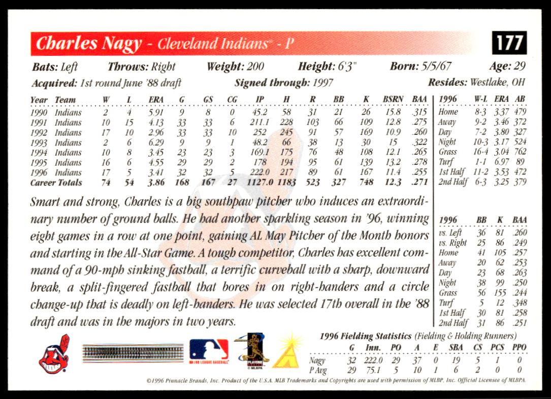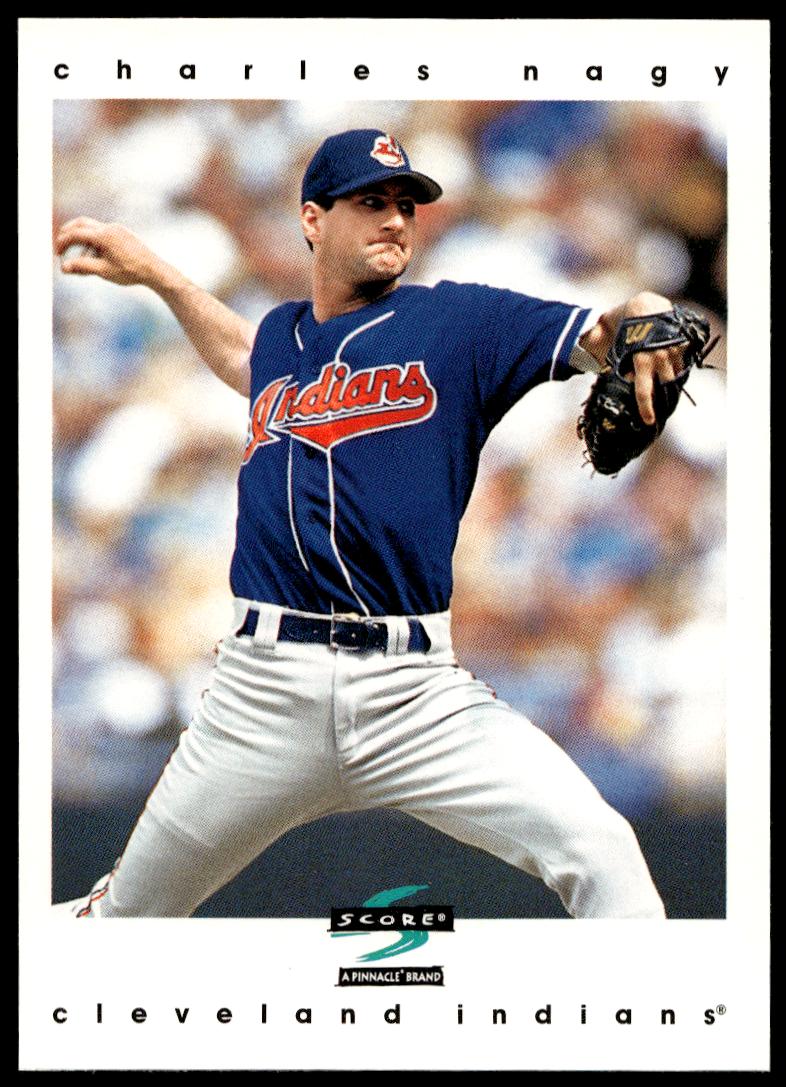 This BaseballΒ card, from 1997 is part of the Pinnacle ScoreΒ card set. Charles Nagy is featured and has a card number of 10.