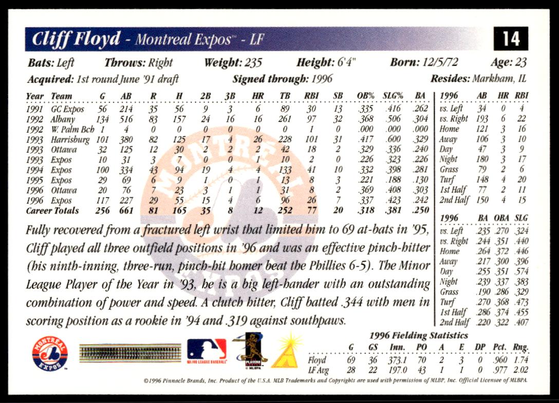 This Baseball card, from 1997 is part of the Pinnacle Score card set. Cliff Floyd is featured and has a card number of 14.