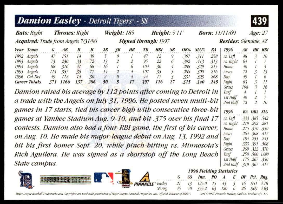 This BaseballΒ card, from 1997 is part of the Pinnacle ScoreΒ card set. Damion Easley is featured and has a card number of 439.