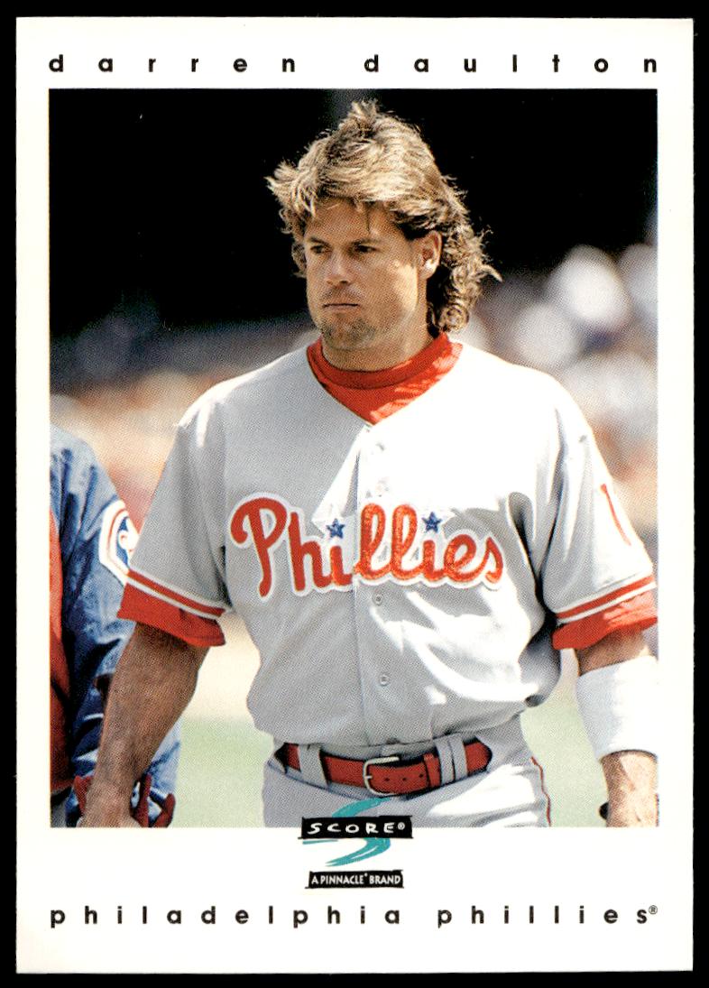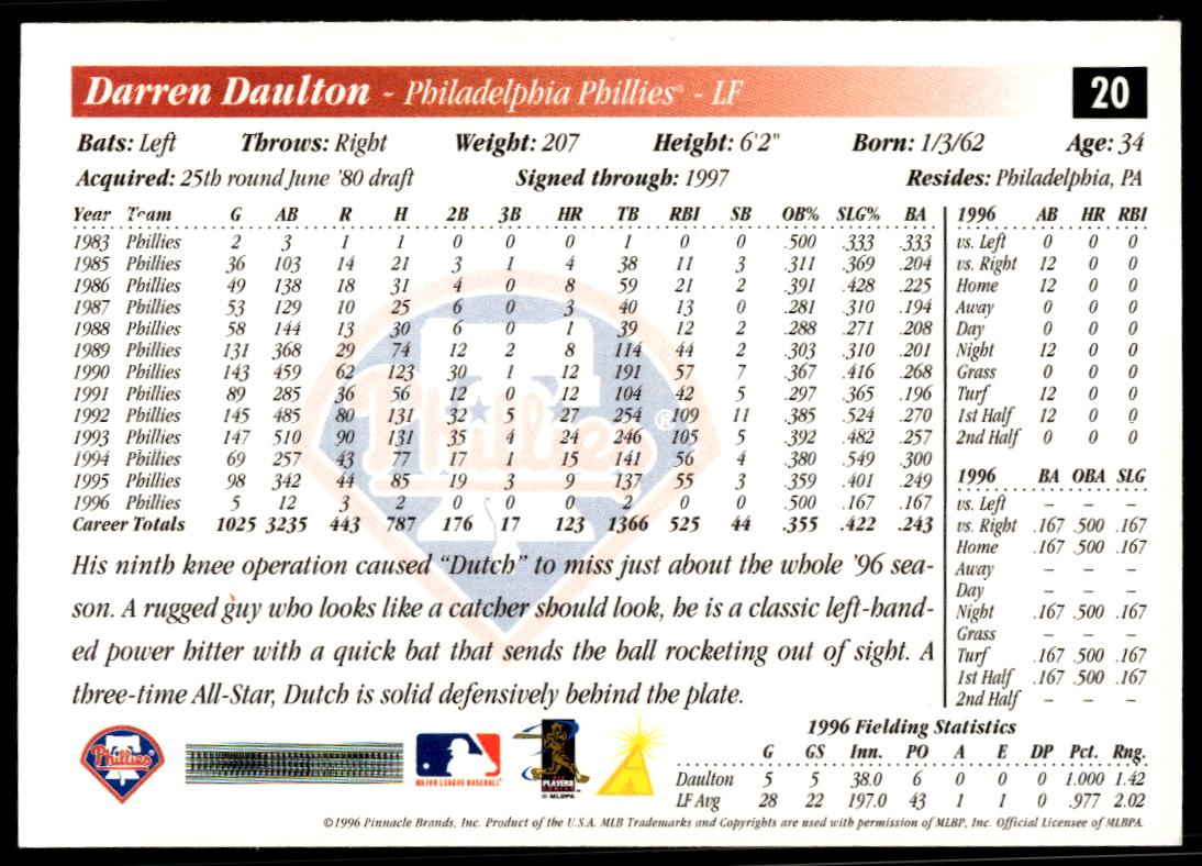 This Baseball card, from 1997 is part of the Pinnacle Score card set. Darren Daulton is featured and has a card number of 20.