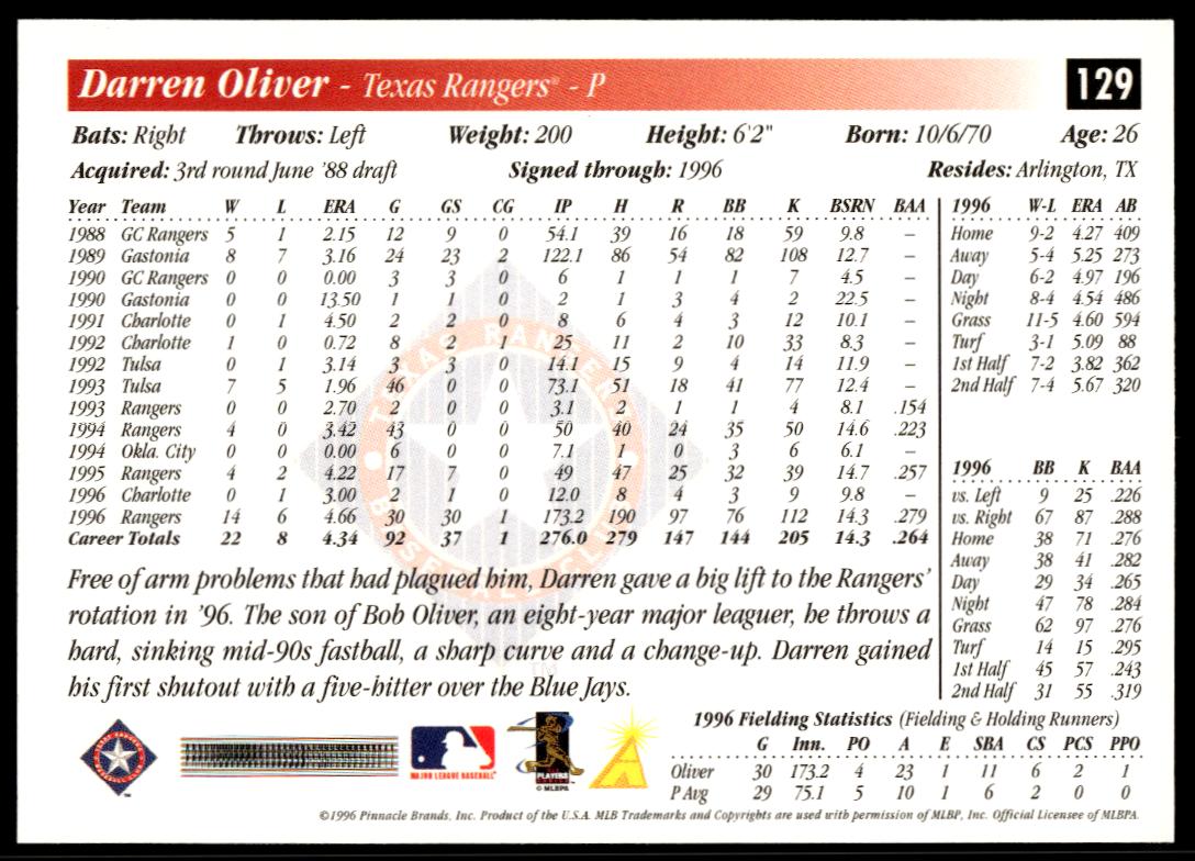 This BaseballΒ card, from 1997 is part of the Pinnacle ScoreΒ card set. Darren Oliver is featured and has a card number of 6.