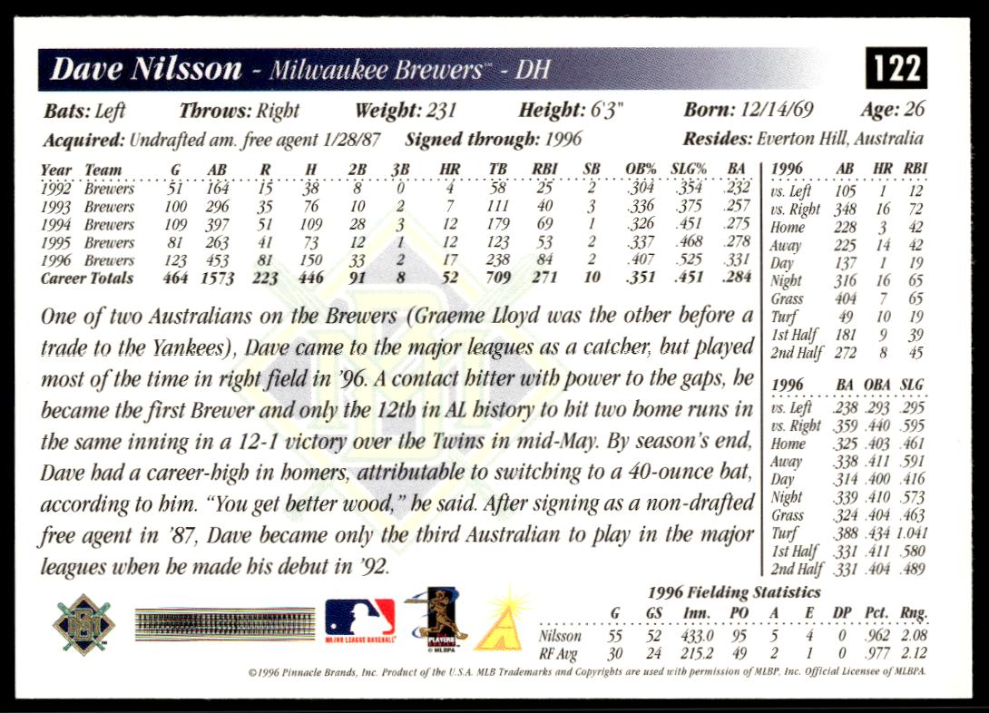 This BaseballΒ card, from 1997 is part of the Pinnacle ScoreΒ card set. Dave Nilsson is featured and has a card number of 122.