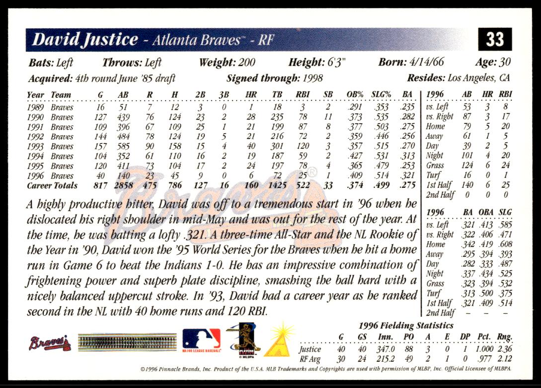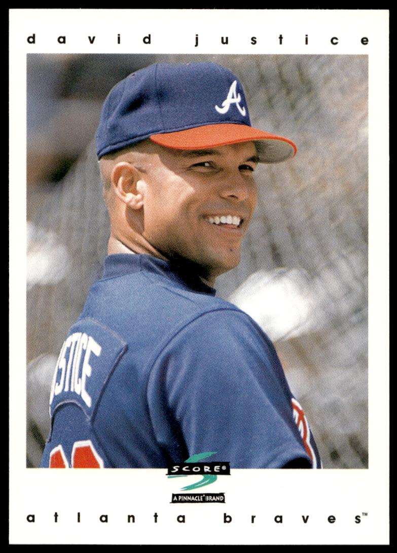 This BaseballΒ card, from 1997 is part of the Pinnacle ScoreΒ card set. David Justice is featured and has a card number of 2.