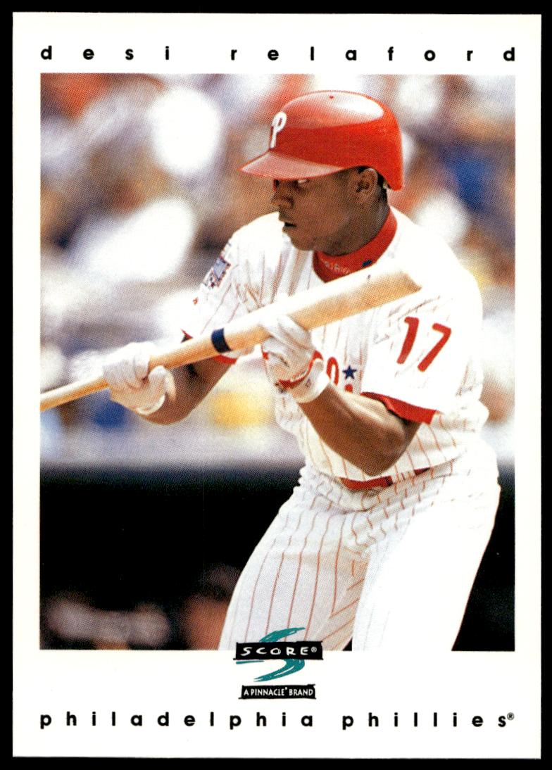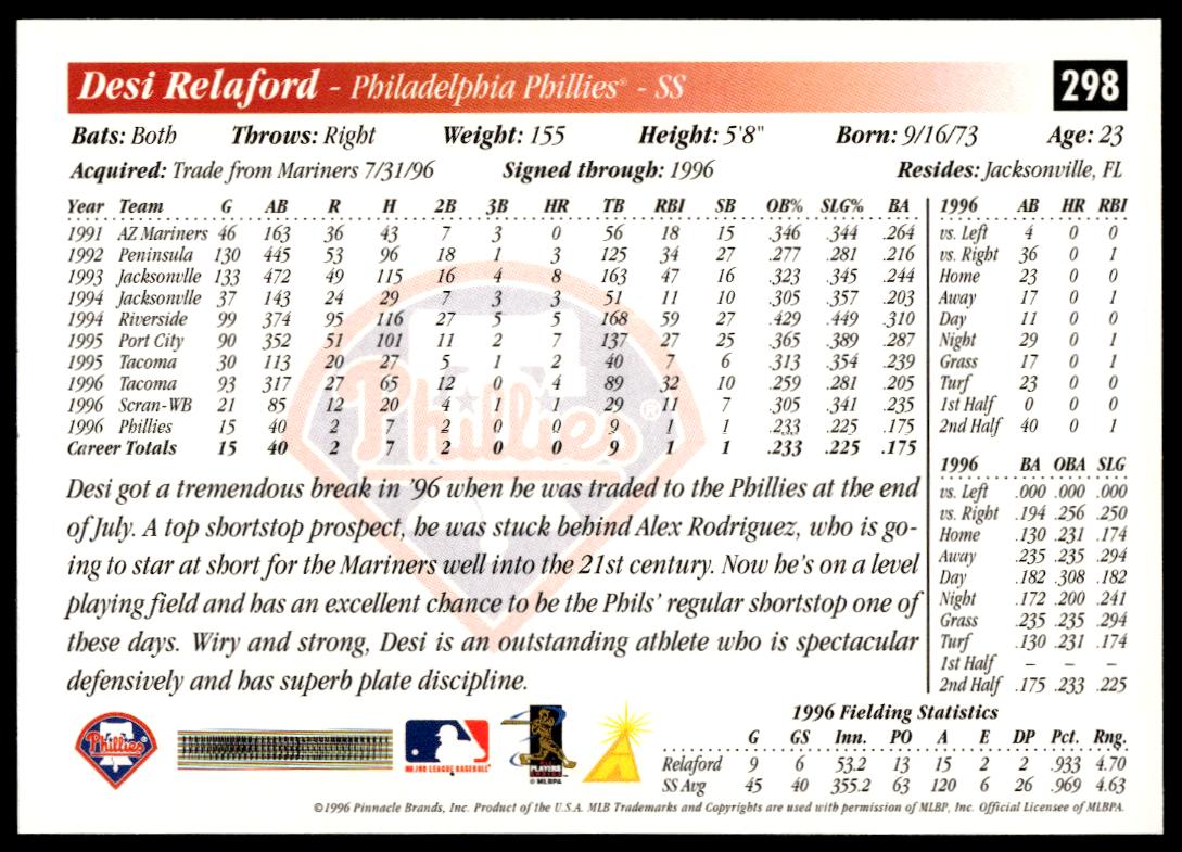 This BaseballΒ card, from 1997 is part of the Pinnacle ScoreΒ card set. Desi Relaford is featured and has a card number of 298.