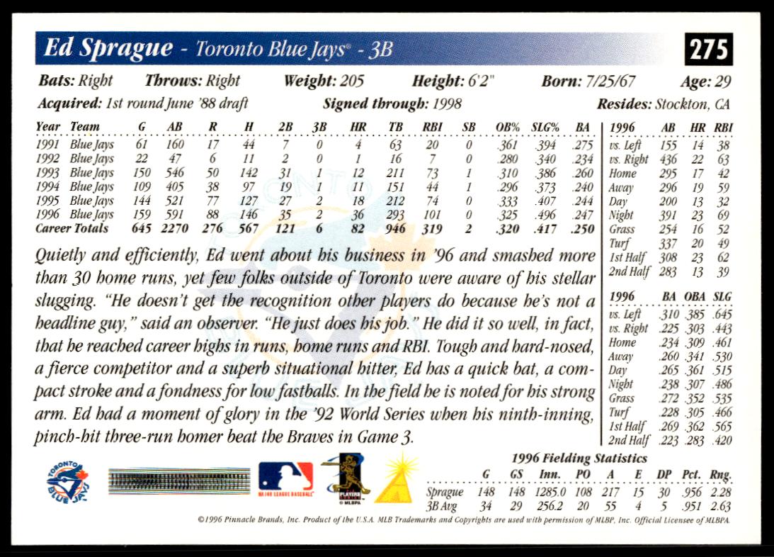 This Baseball card, from 1997 is part of the Pinnacle Score card set. Ed Sprague is featured and has a card number of 275.