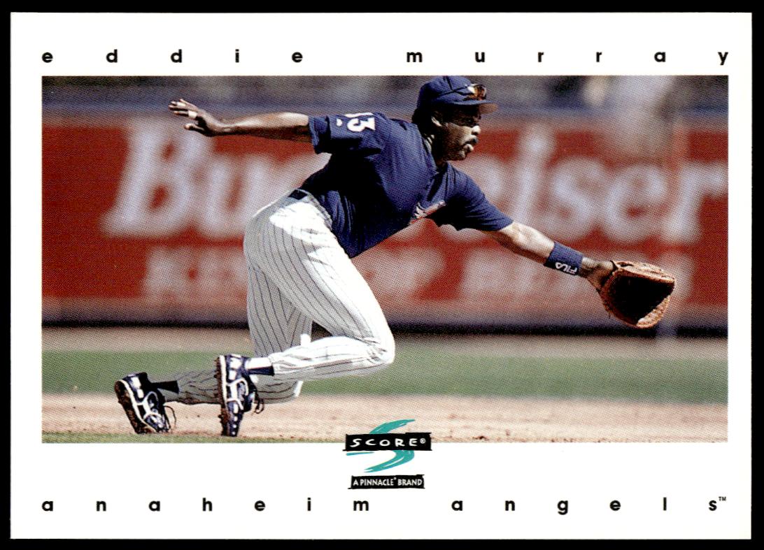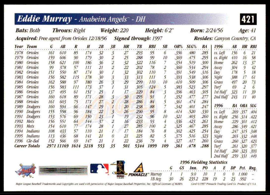 This Baseball card, from 1997 is part of the Pinnacle Score card set. Eddie Murray is featured and has a card number of 421.