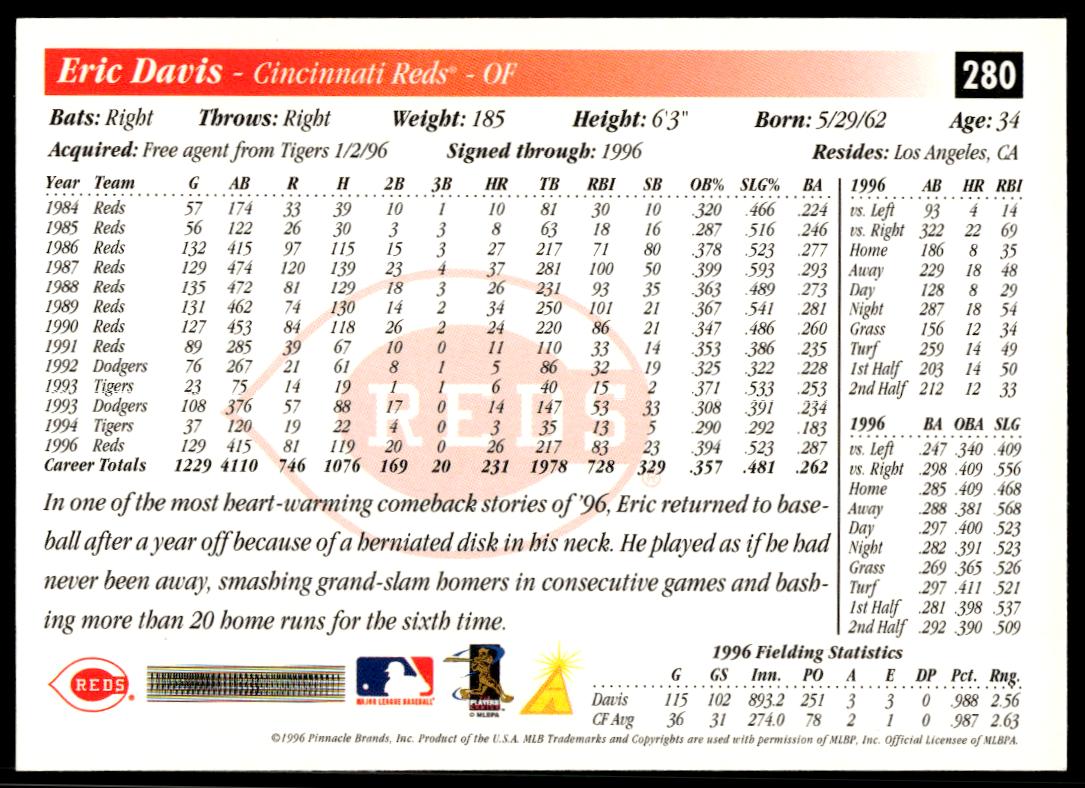 This BaseballΒ card, from 1997 is part of the Pinnacle ScoreΒ card set. Eric Davis is featured and has a card number of 280.