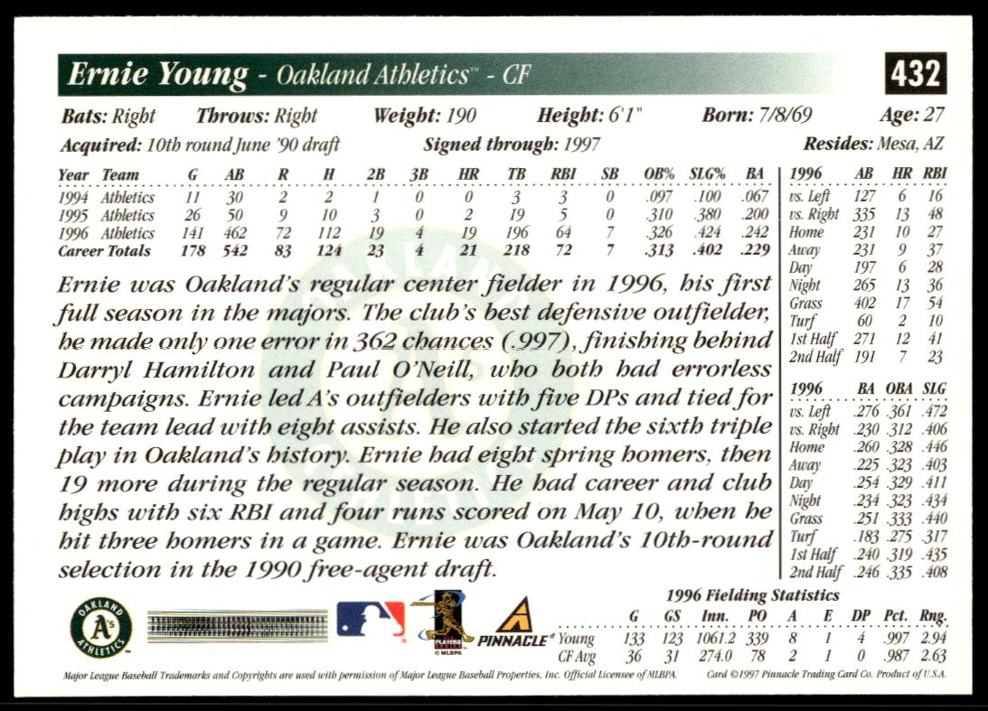 This BaseballΒ card, from 1997 is part of the Pinnacle ScoreΒ card set. Ernie Young is featured and has a card number of 432.