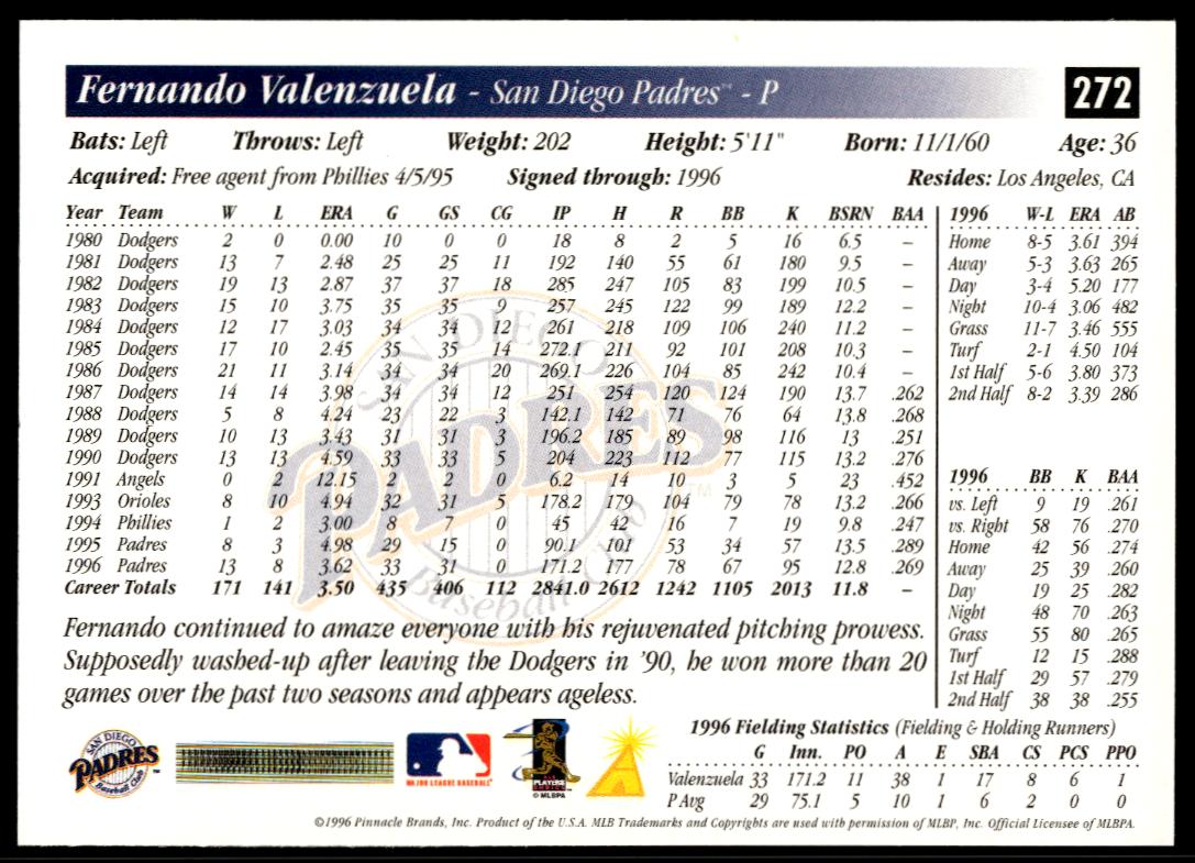 This BaseballΒ card, from 1997 is part of the Pinnacle ScoreΒ card set. Fernando Valenzuela is featured and has a card number of 272.