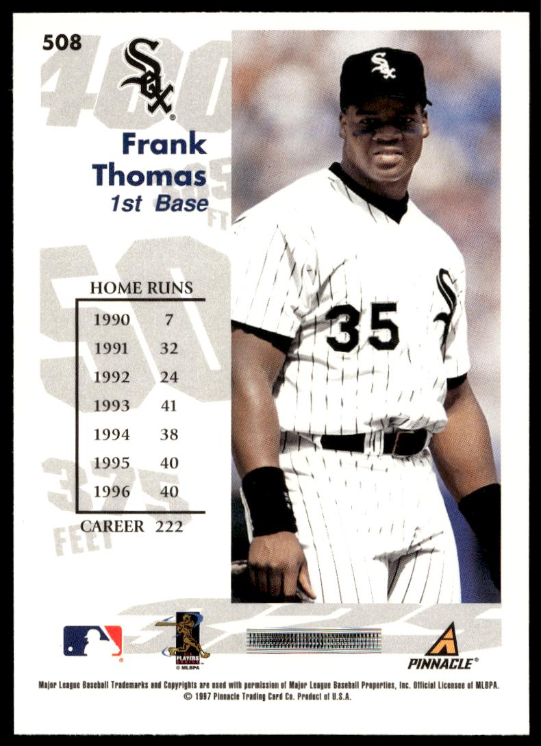 This BaseballΒ card, from 1997 is part of the Pinnacle ScoreΒ card set. Frank Thomas is featured and has a card number of 508.
