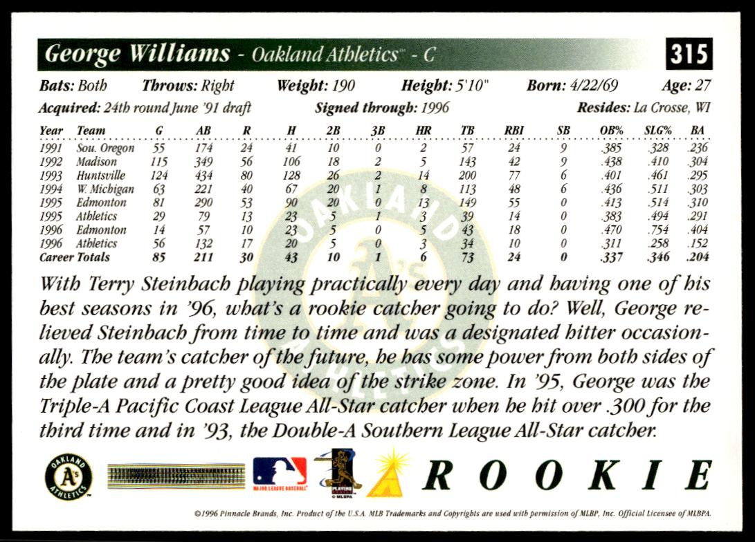 This BaseballΒ card, from 1997 is part of the Pinnacle ScoreΒ card set. George Williams is featured and has a card number of 315.