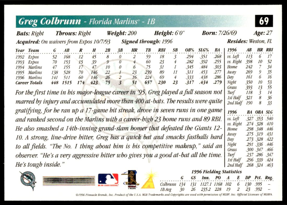 This BaseballΒ card, from 1997 is part of the Pinnacle ScoreΒ card set. Greg Colbrunn is featured and has a card number of 69.