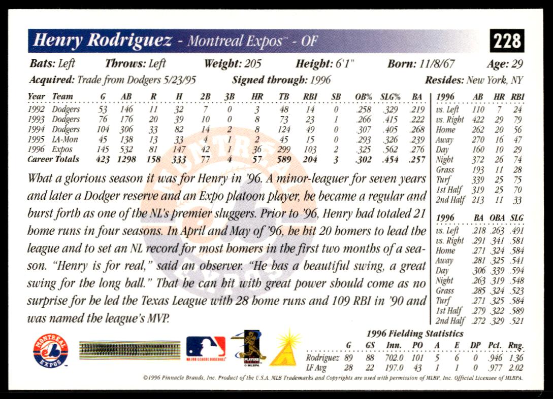 This BaseballΒ card, from 1997 is part of the Pinnacle ScoreΒ card set. Henry Rodriguez is featured and has a card number of 228.