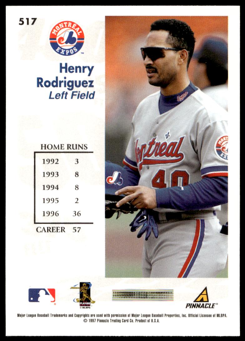 This BaseballΒ card, from 1997 is part of the Pinnacle ScoreΒ card set. Henry Rodriguez is featured and has a card number of HR517.