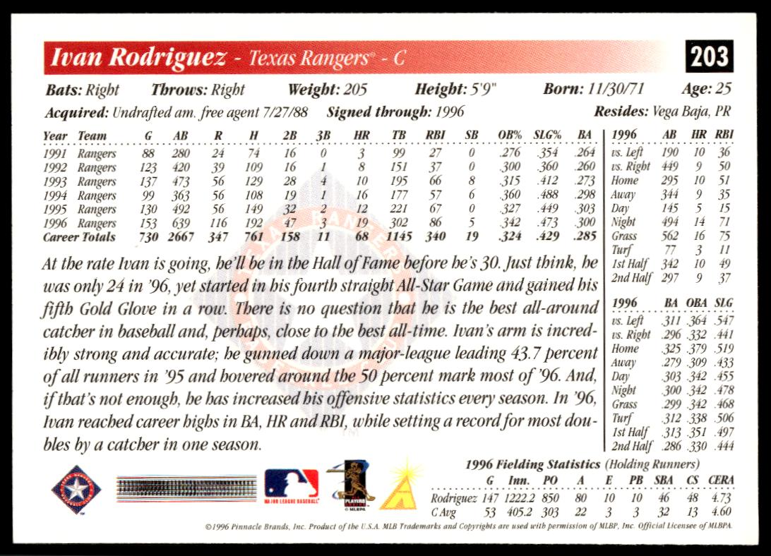 This Baseball card, from 1997 is part of the Pinnacle Score card set. Ivan Rodriguez is featured and has a card number of 12.