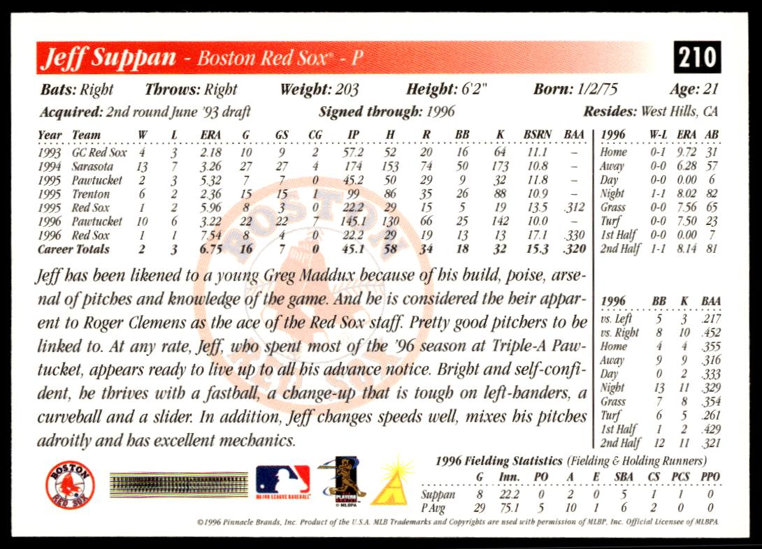 This BaseballΒ card, from 1997 is part of the Pinnacle ScoreΒ card set. Jeff Suppan is featured and has a card number of 210.