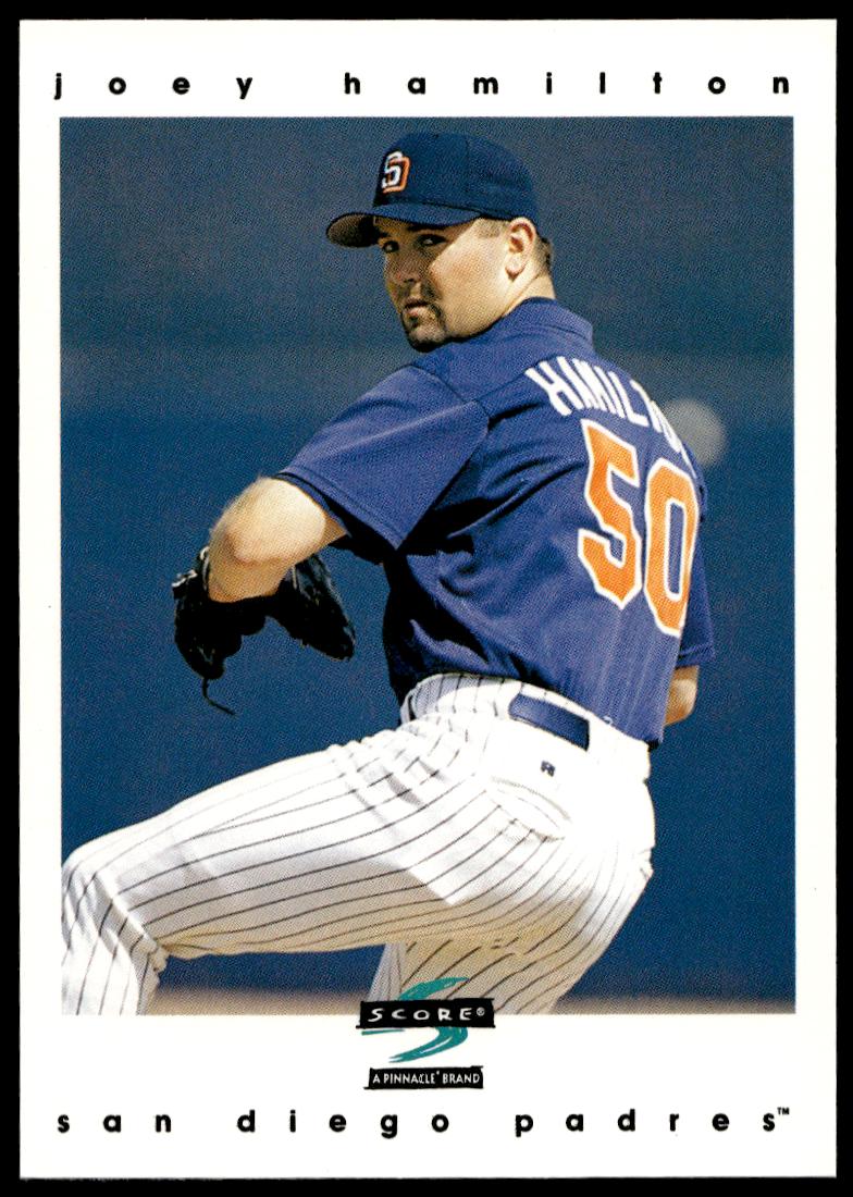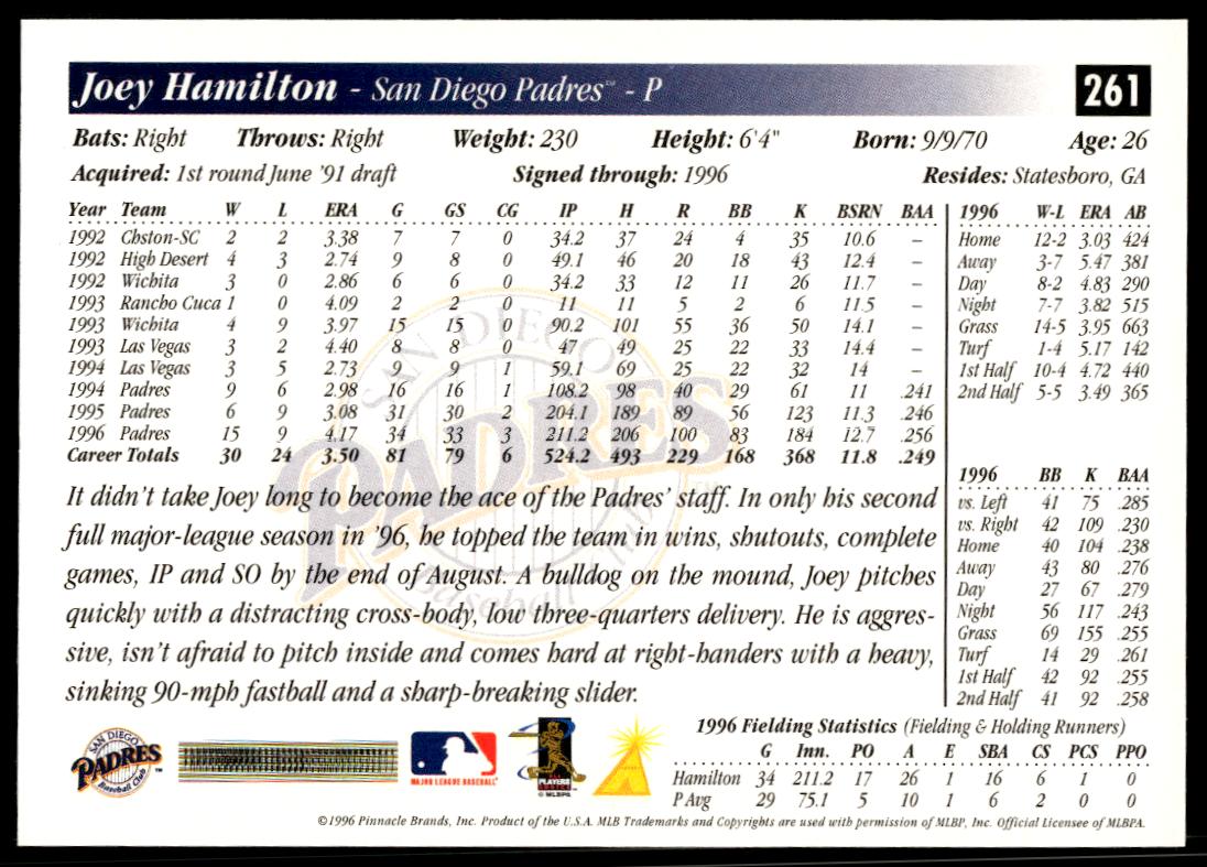 This BaseballΒ card, from 1997 is part of the Pinnacle ScoreΒ card set. Joey Hamilton is featured and has a card number of 261.